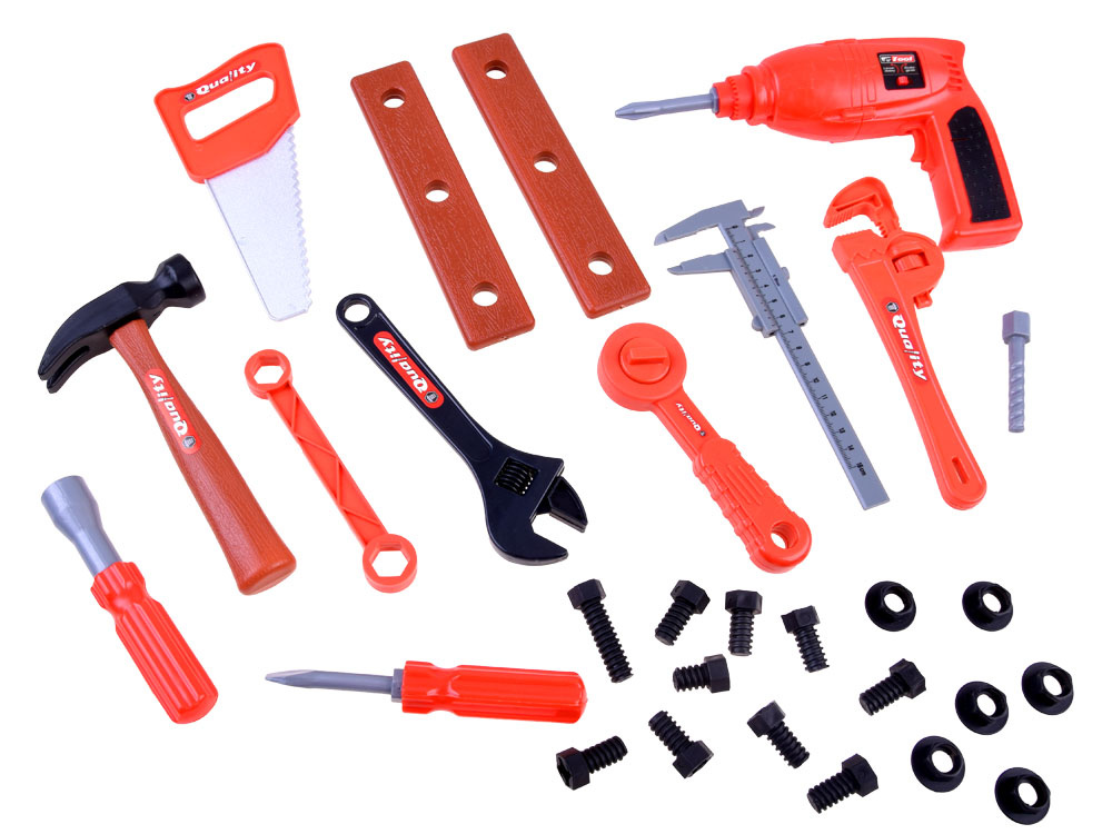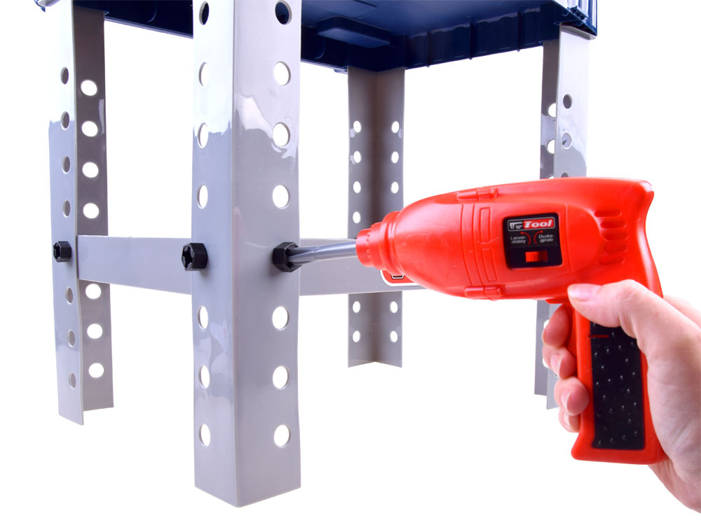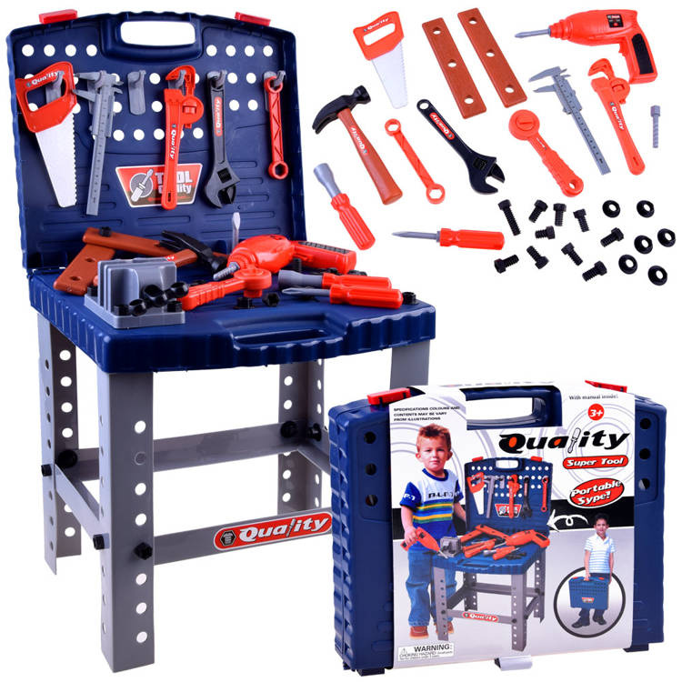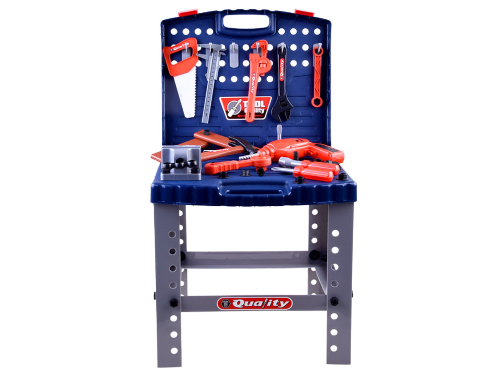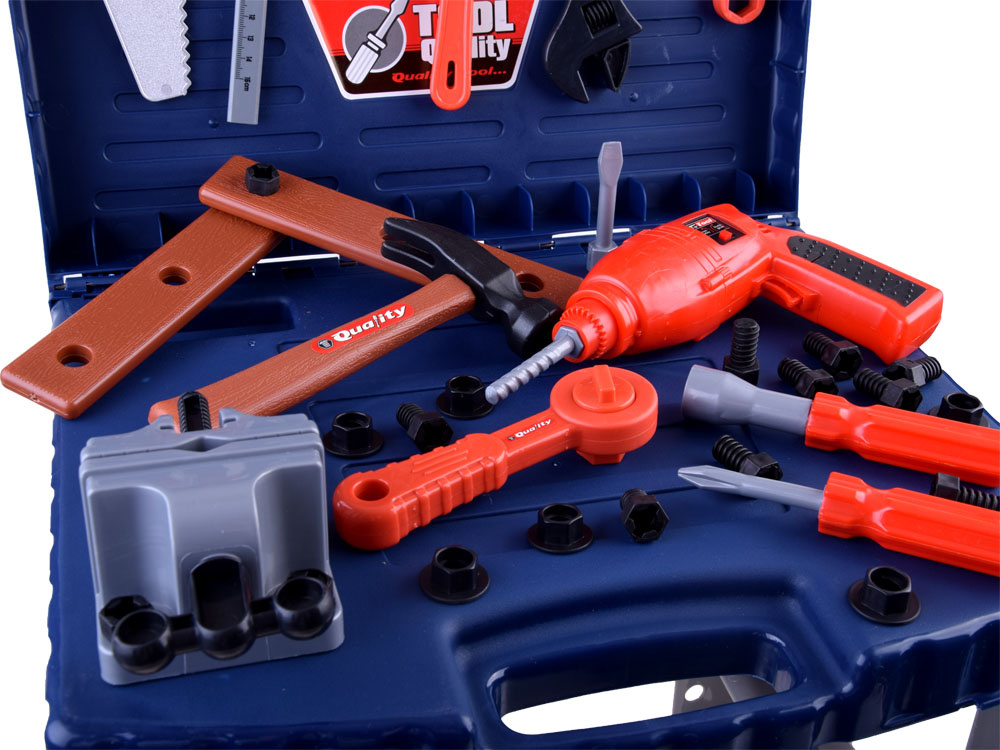 Bogat komplet za male mojstre, ki je shranjen v praktičnem kovčku, ki se zlahka spremeni v delavnico.