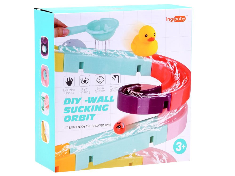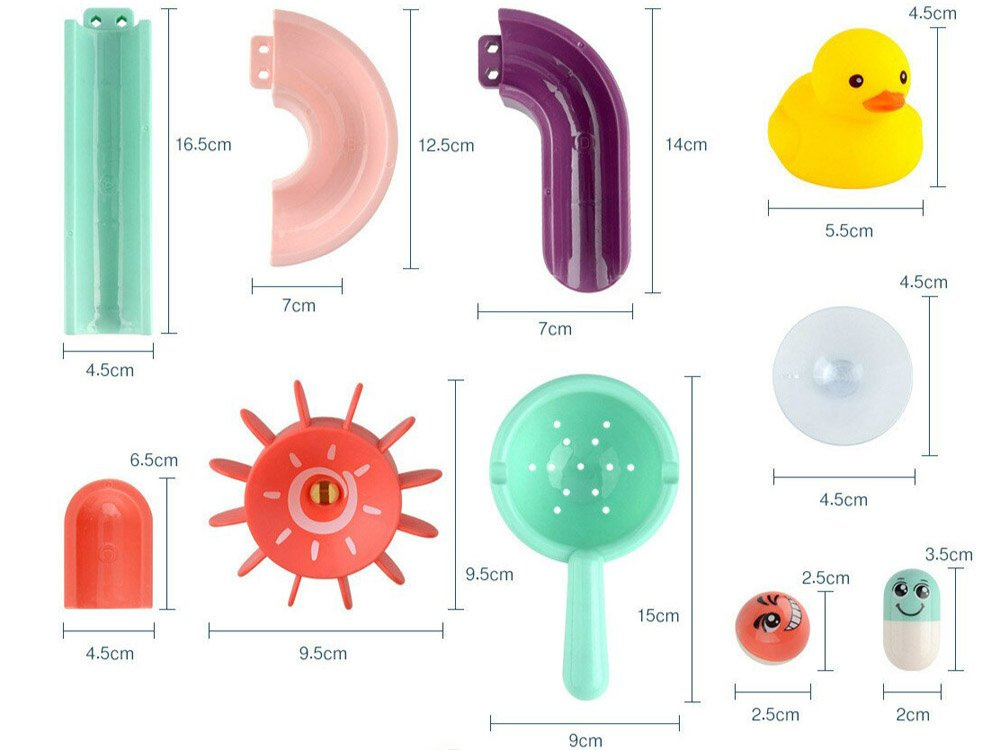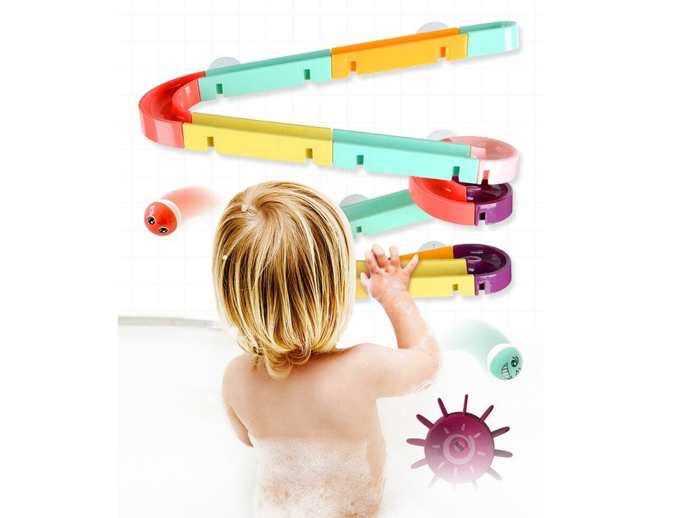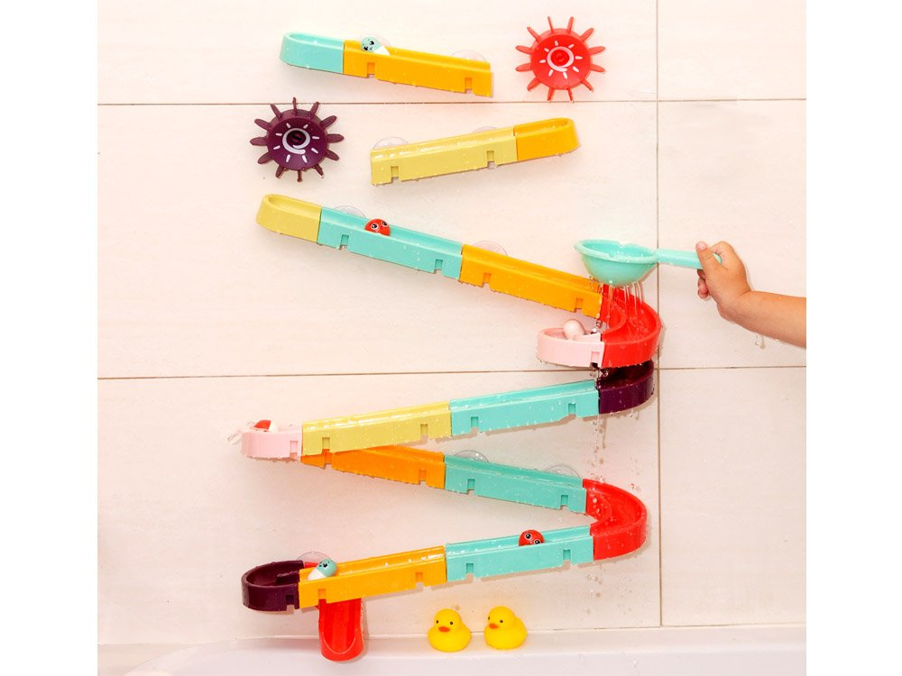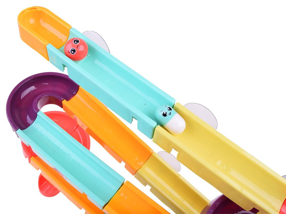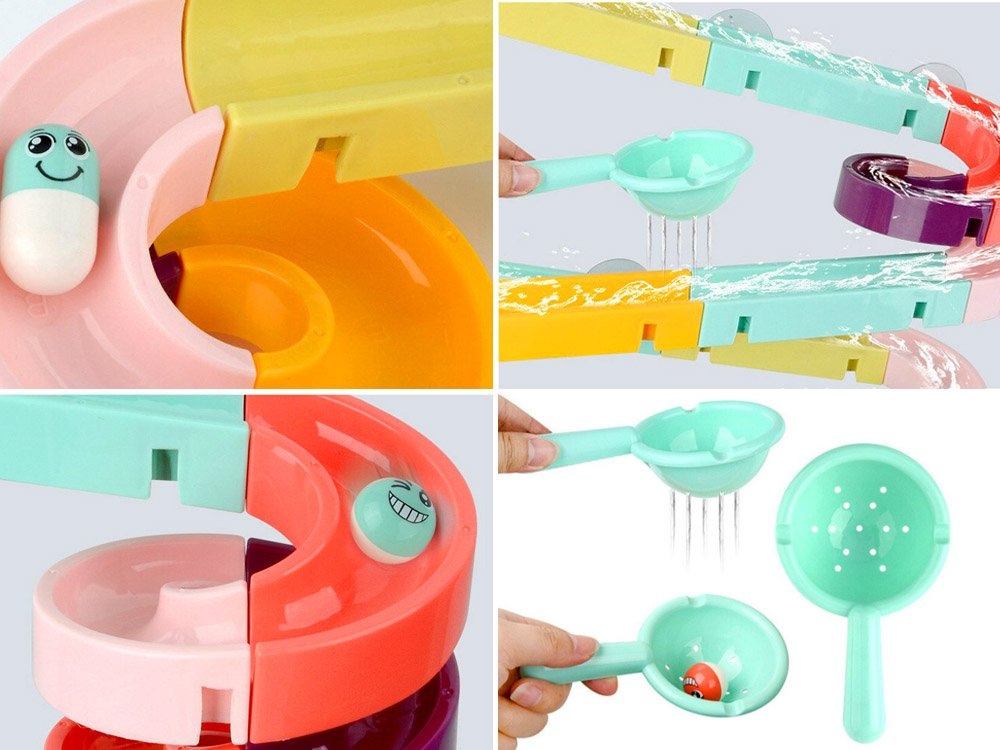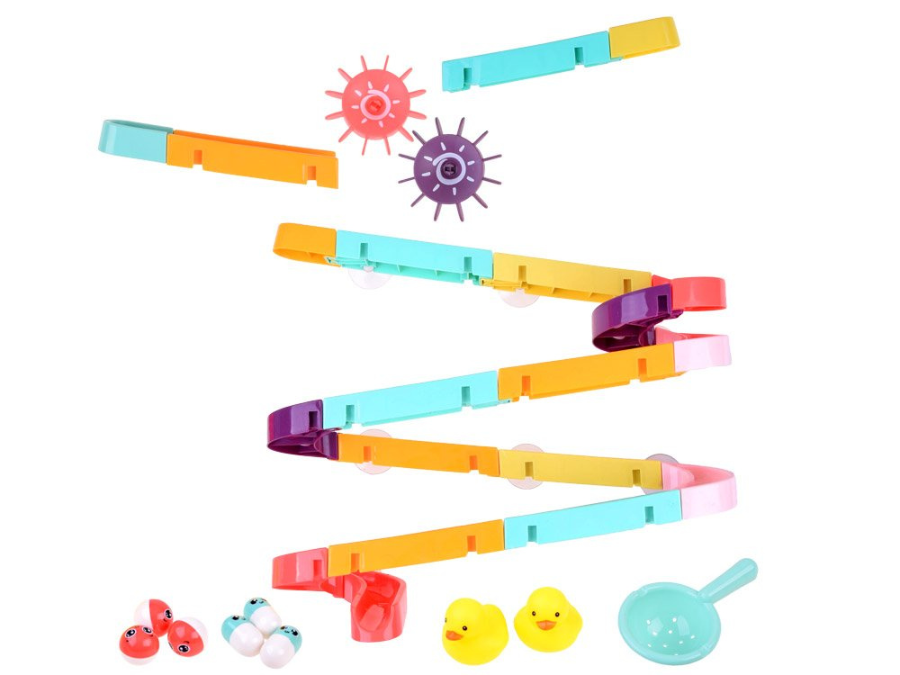 Del paketa so barvni deli za sestavljanje spiralne steze, gumijaste račke, žogice, fižol in cedilo. Med kopanjem si lahko otrok izmišlja fantastične igre z bežečo račko, lovljenjem žogice in valji, ki jih je mogoče prilepiti drug ob drugega, da lahko otrok vrti oba hkrati. Set vsebuje 44 kosov, iz katerih si lahko sestavite tobogan.- plastični elementi za gradnjo proge