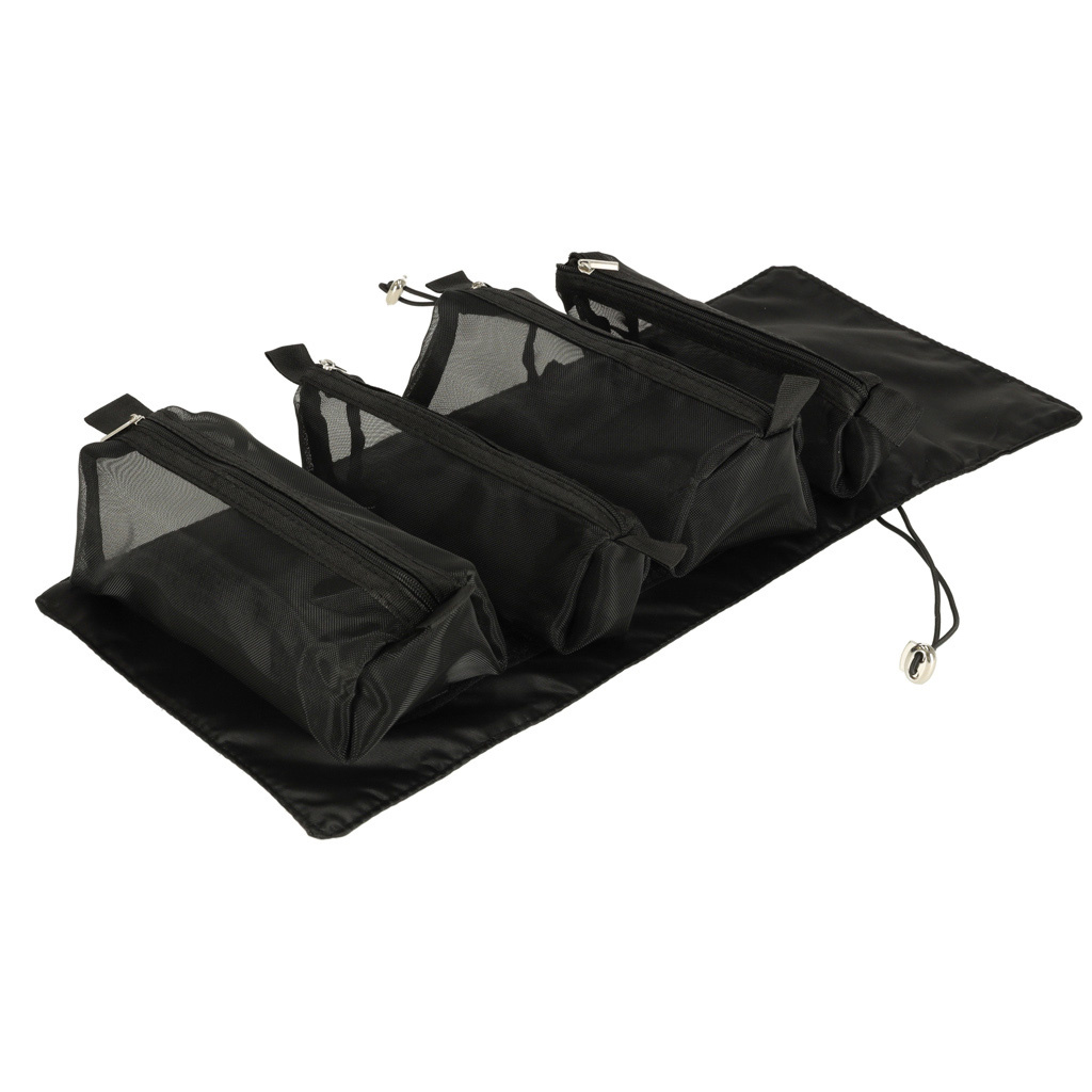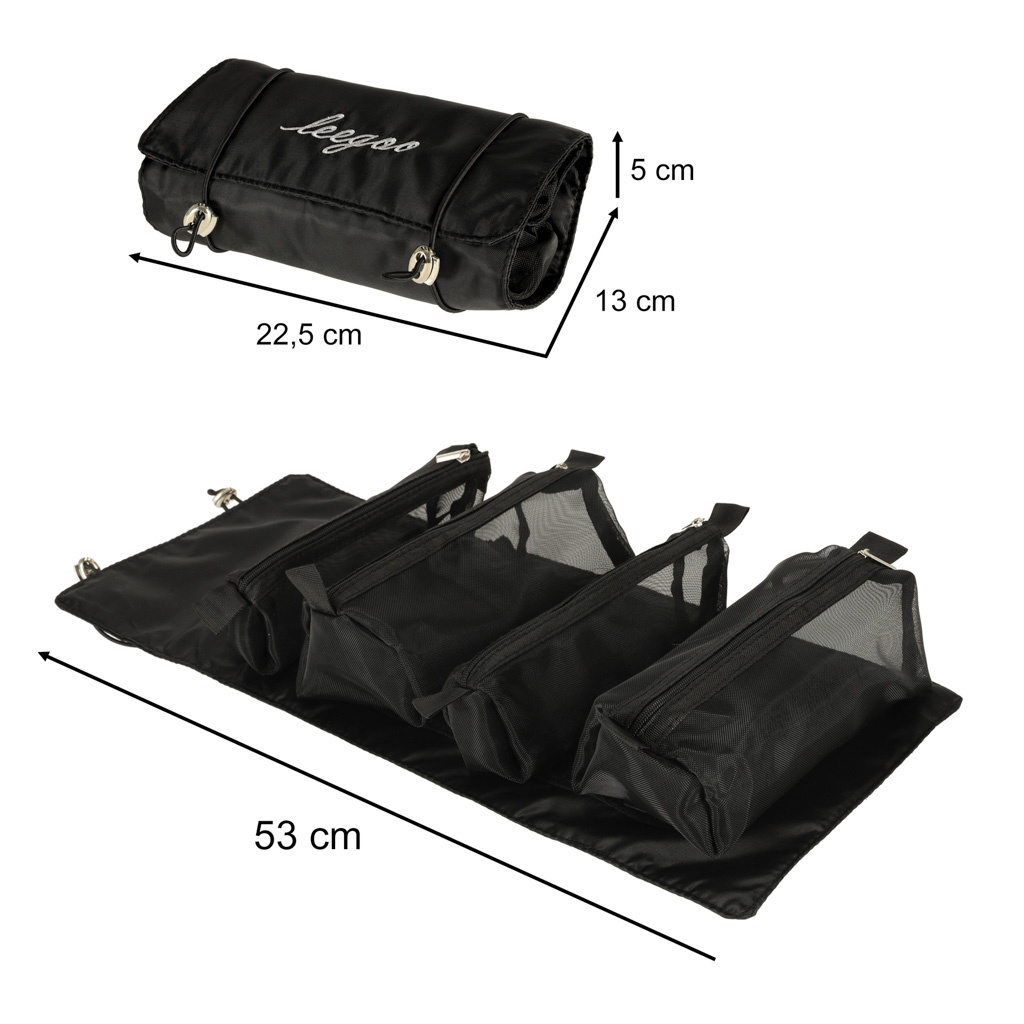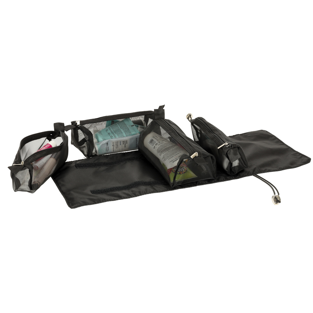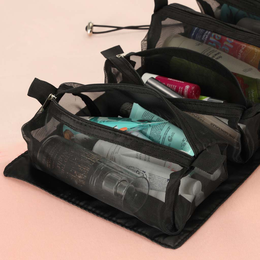 Črna potovalna kozmetična torbica - lahko se zvije, da v prtljagi zavzame manj prostora. Ima štiri predale, ki jih je mogoče odstraniti. Stene predalčkov so izdelane iz mreže, ki olajša iskanje izdelkov in zagotavlja dobro prezračevanje mokrih embalaž.