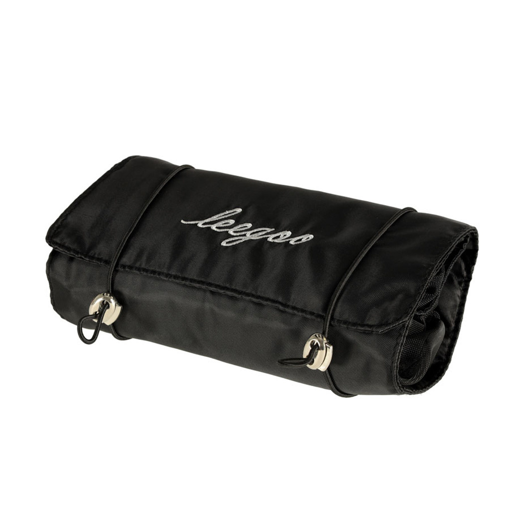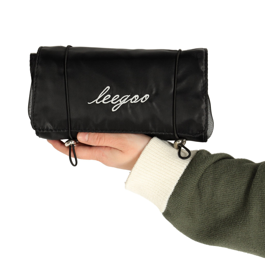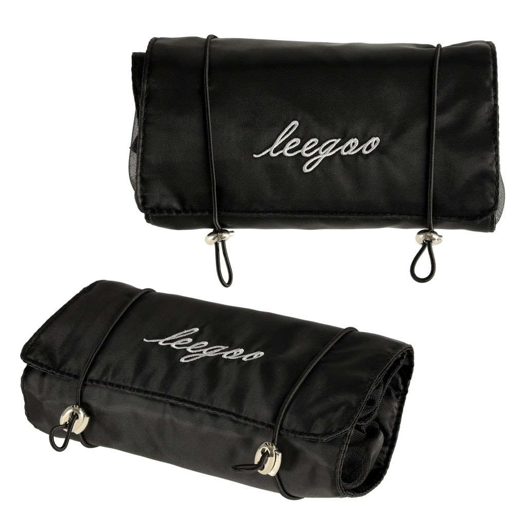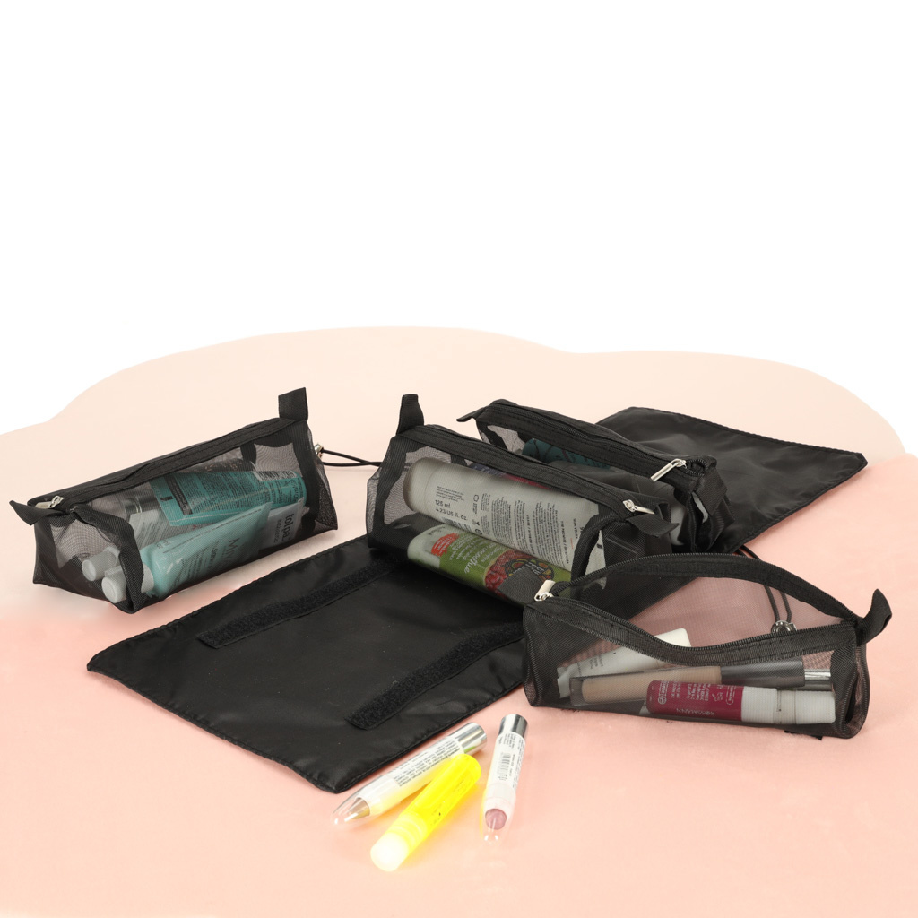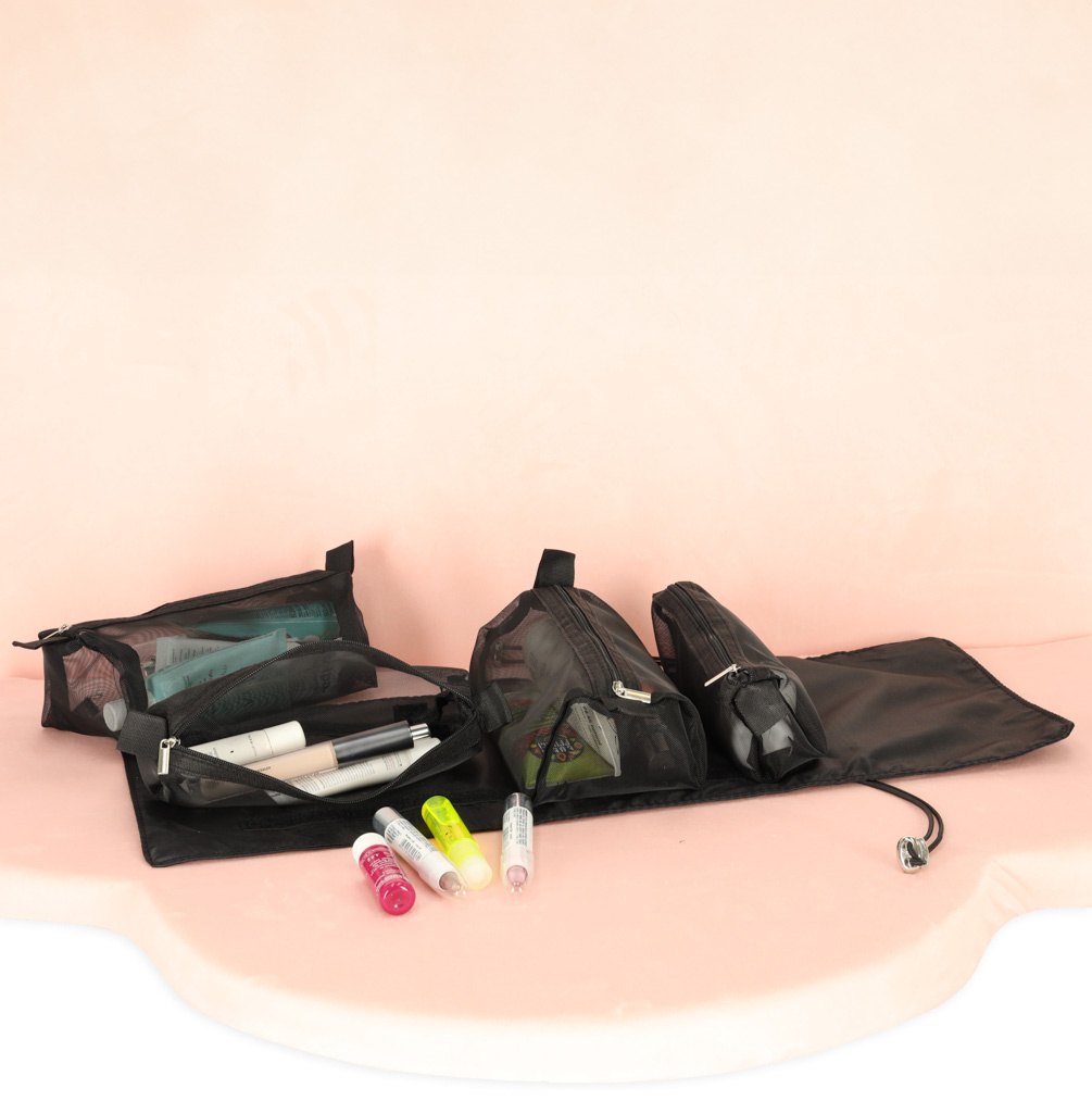 Črna potovalna kozmetična torbica - lahko se zvije, da v prtljagi zavzame manj prostora. Ima štiri predale, ki jih je mogoče odstraniti. Stene predalčkov so izdelane iz mreže, ki olajša iskanje izdelkov in zagotavlja dobro prezračevanje mokrih embalaž.